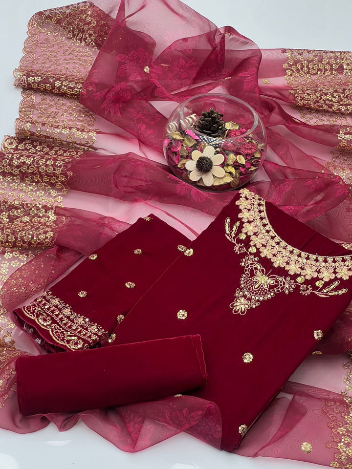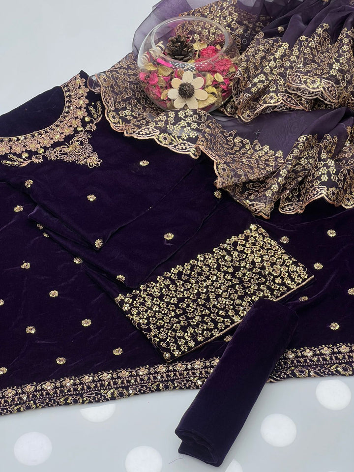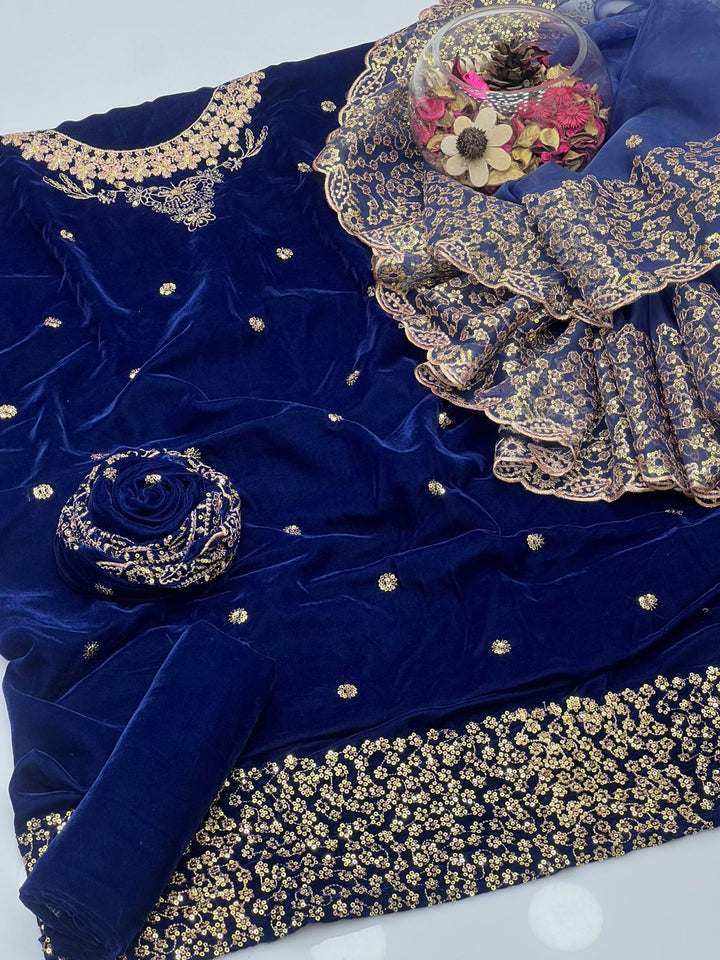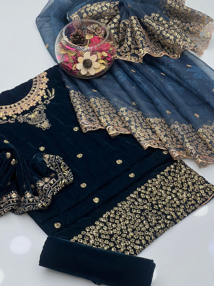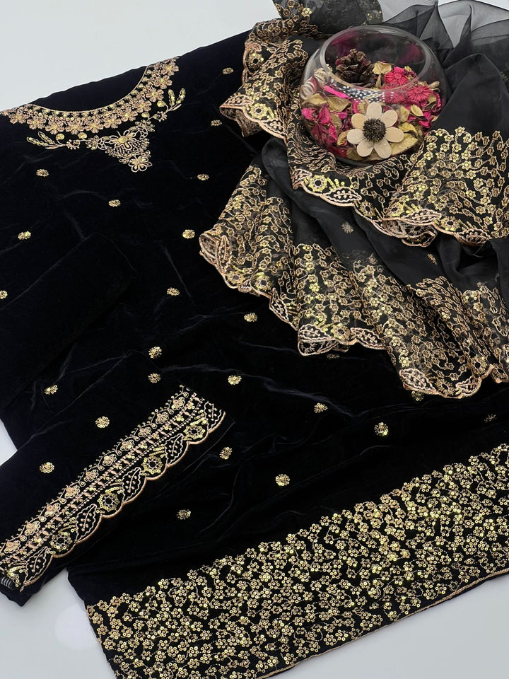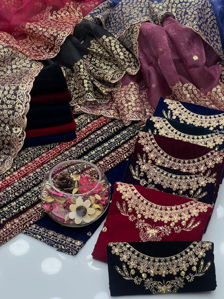9000 Micro Valvet Fancy Sequence Work Gala Border, Heavy Sleeves Work Shirt , Plain Valvet Trouser Along With Organza Digital Print With Sequence Work 2 Side Border Dupatta 3 Pcs Dress ๐.