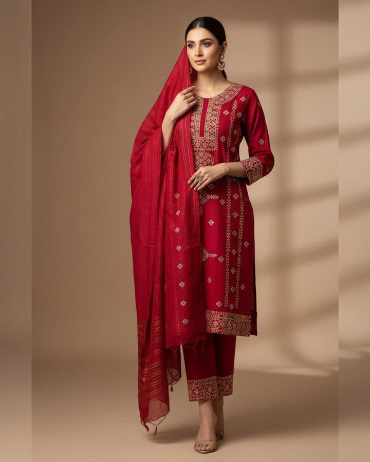 Bana Dora Dhanak Fabric Gala Border Shirt With Bana Dora Dhanak Fabric Embroided Trouser Along With Dhanak Velvet Straps Shawl 3pcs Dress π.Β