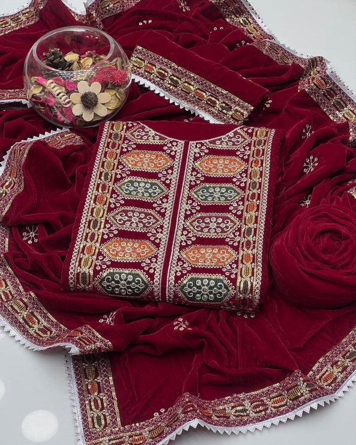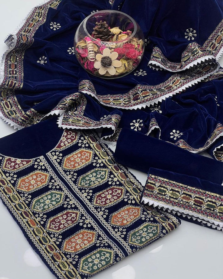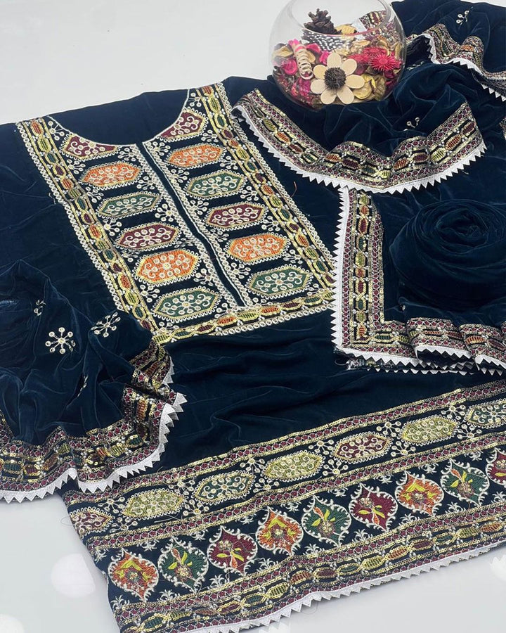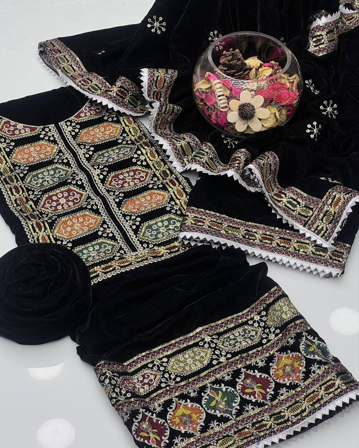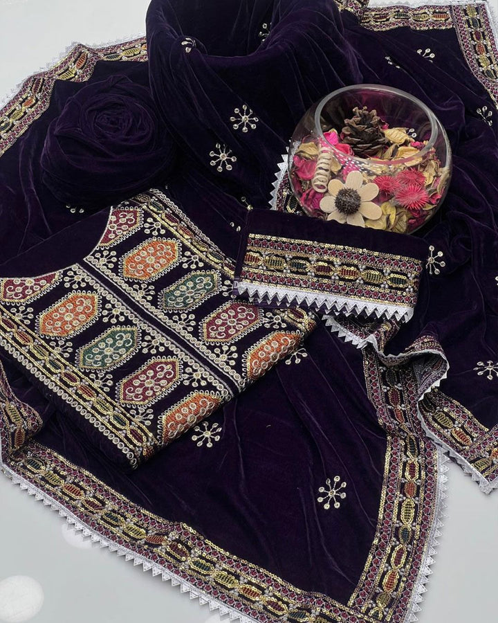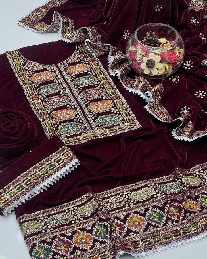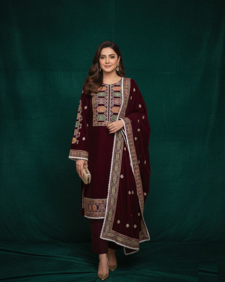 Fancy Multi Embroidered Pure 9000 Micro Pound Velvet Shirt & Trouser With Fancy Valvet Ready To Wear Shawl 3 Pcs Dress ๐.