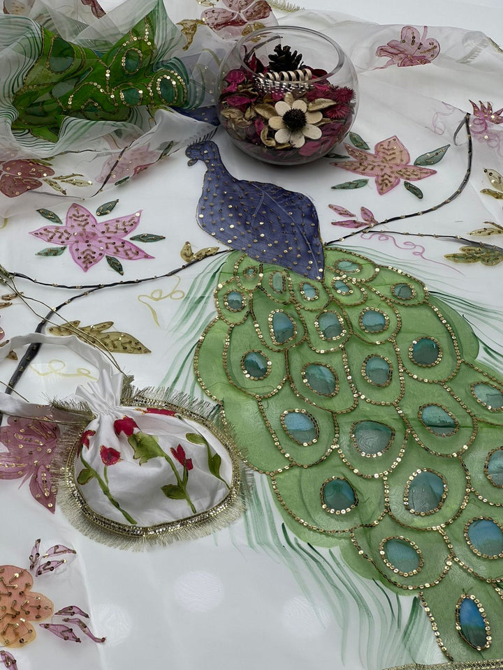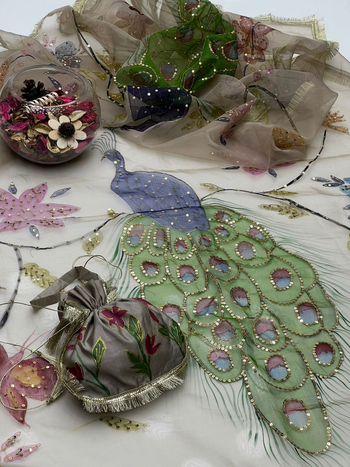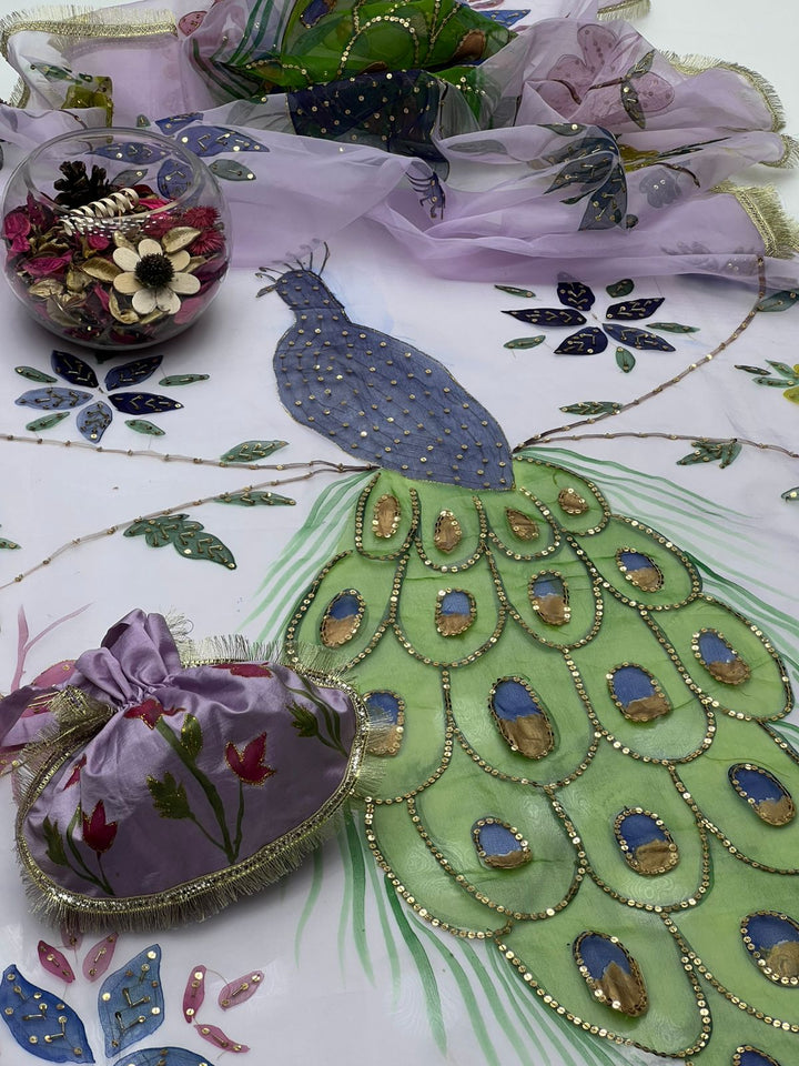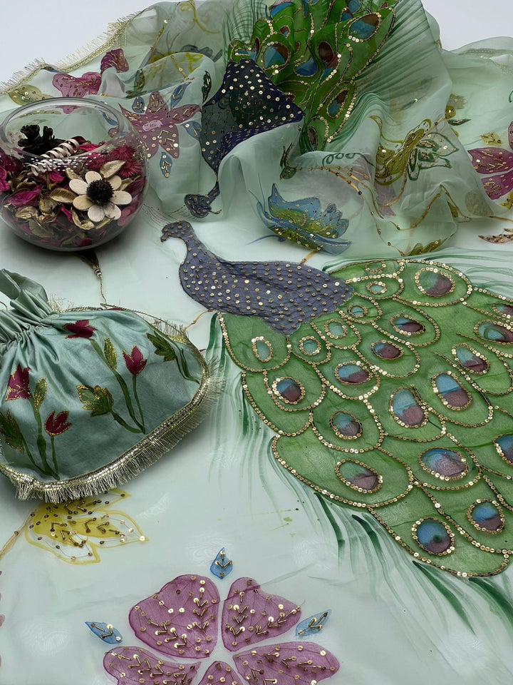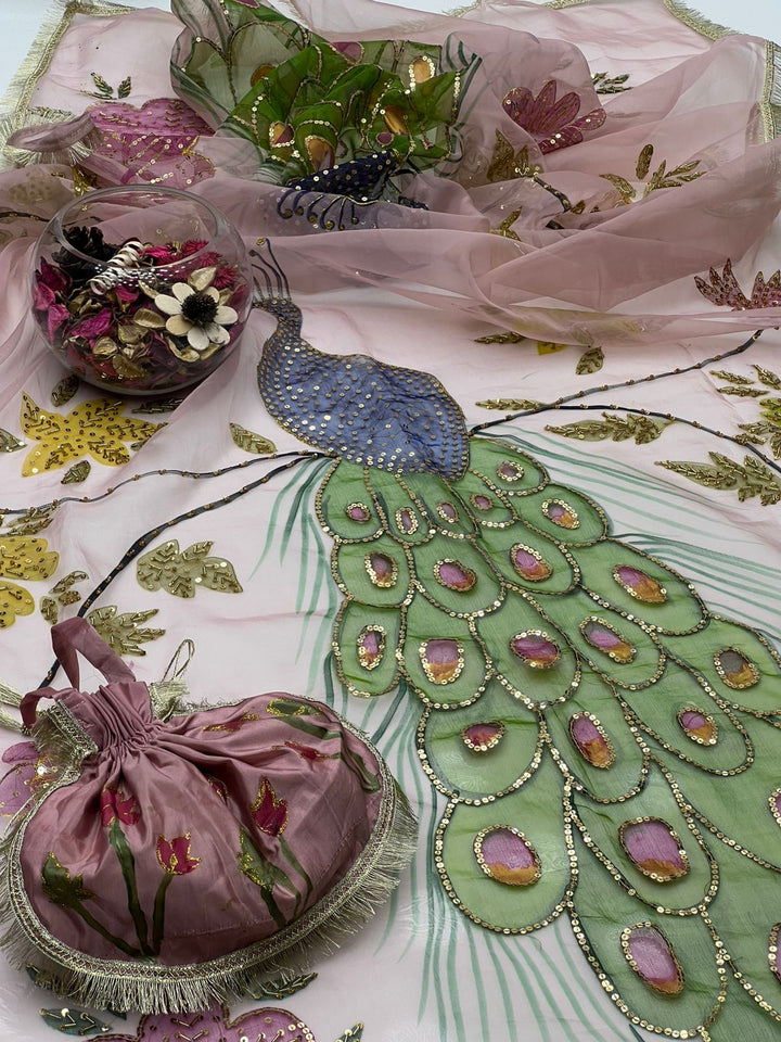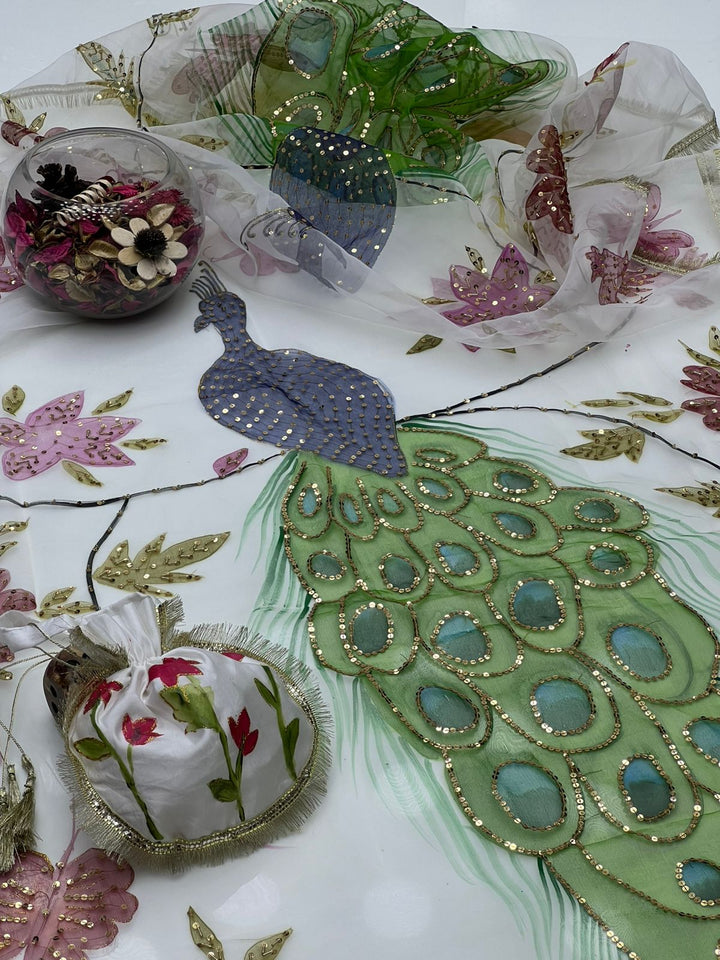 Organza Hand Work Beats Sequence & Oil Paint Peacock 🦚 Style 4 Sided  Lace Work Dupatta Including Bridal Pouch.Â