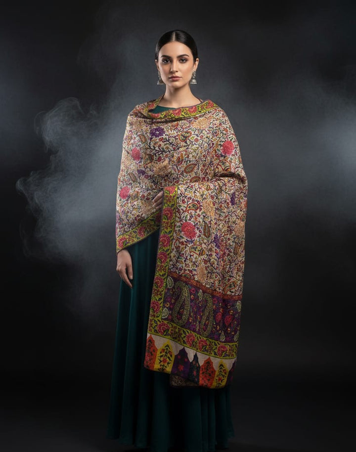 Pure Pashmina Wool Anarkali Style Jaal With Border Style Digital Print Shawl.