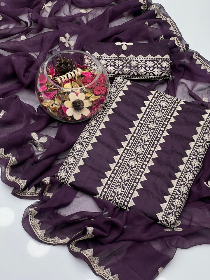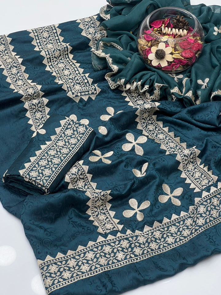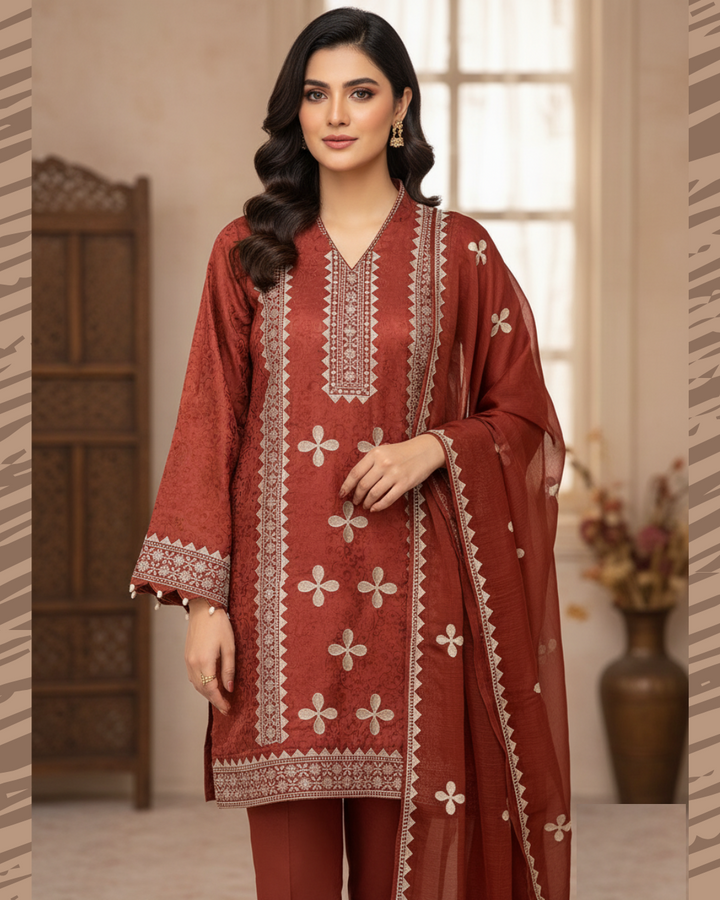 Self Print Viscose Applick Style Cross Stitch Embroidery Shirt , Embroided Trouser Along With Chiffon Embroided Dupatta 3 Pcs Dress π.