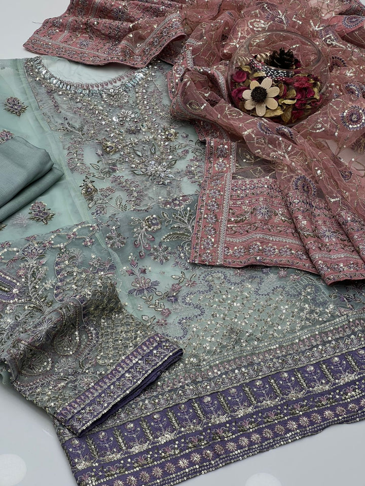 Semi Stitched Luxury Organza Embroided Adda Tanka Handwork Embroided Fornt , Back and Sleeves Shirt, Plain Raw Silk Trouser Along With Organza Fancy Heavy Dupatta 3 Pcs Dress π.