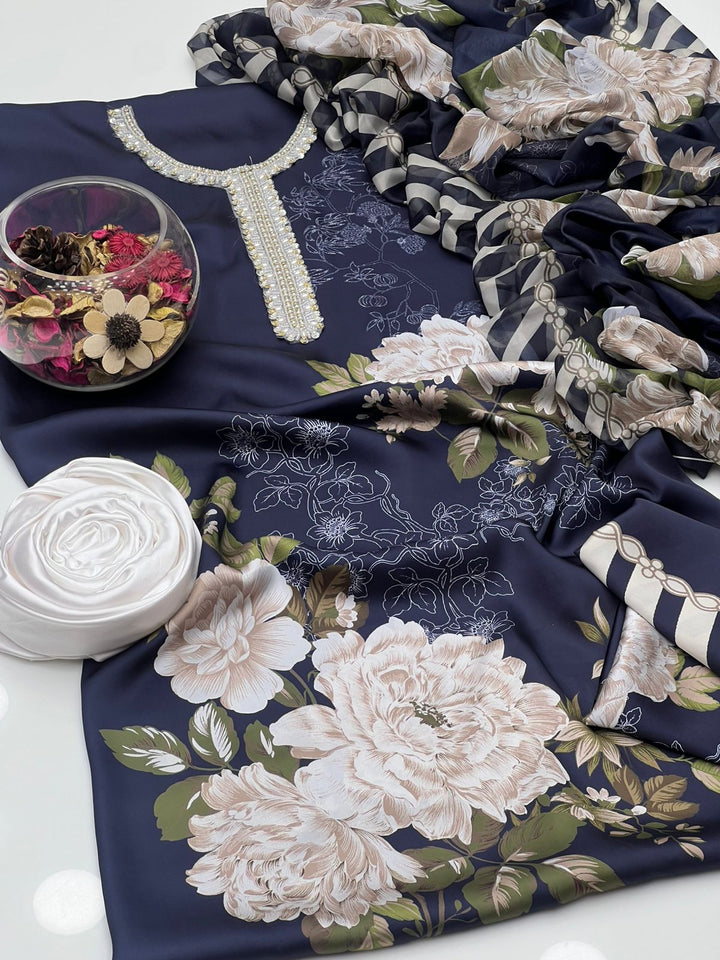 Shamoze Silk Fancy Neck Work & Digital Print Shirt With Simple White Shamoze Silk Trouser Along With Silk Digital Print Dupatta 3Pcs Dress ๐.ย