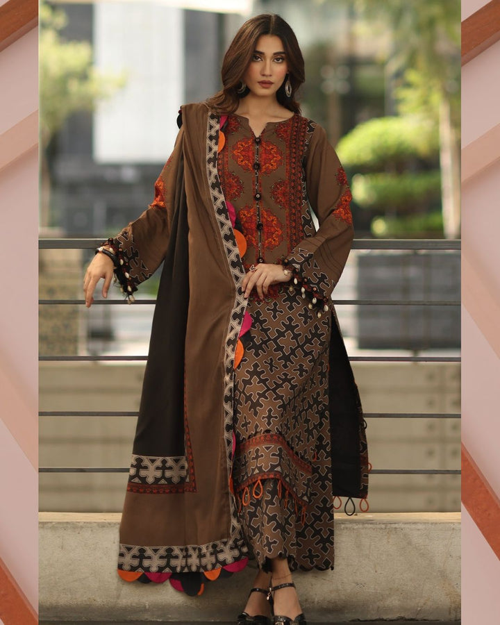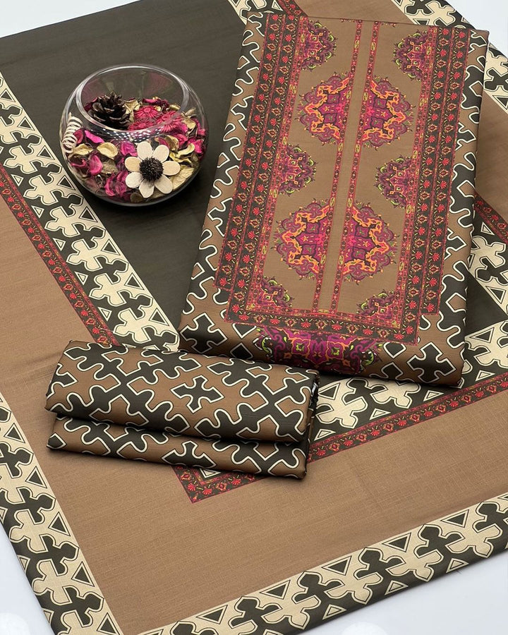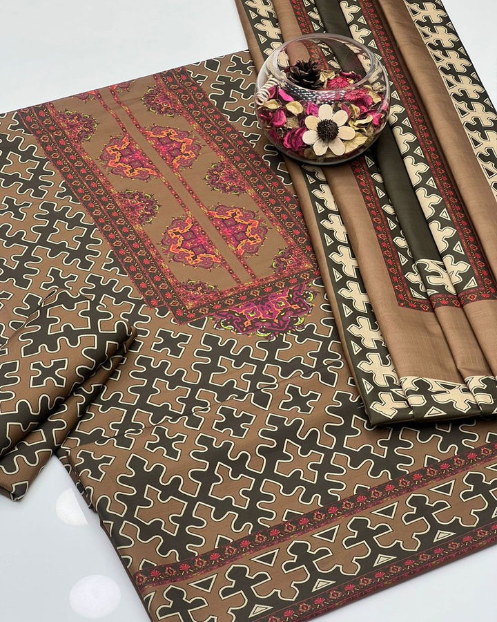 Soft Slub Karandi Digital Print Shirt & Trouser Along With Soft Karandi Khaddar Digital Print Shawl 3 Pcs Dress 👗.