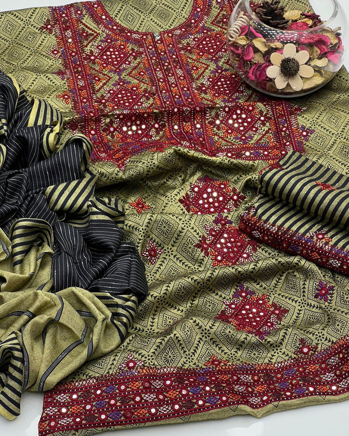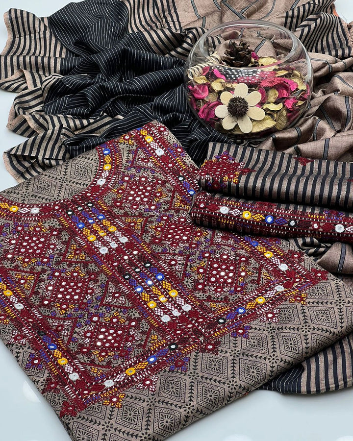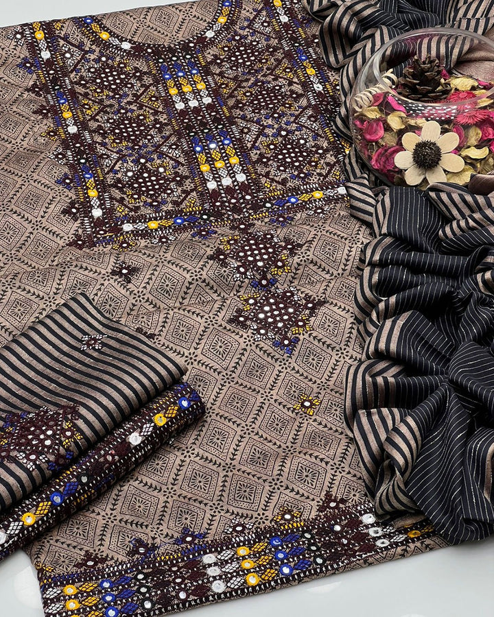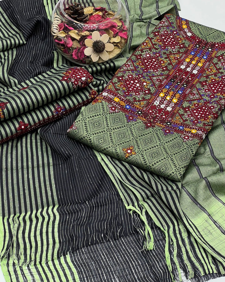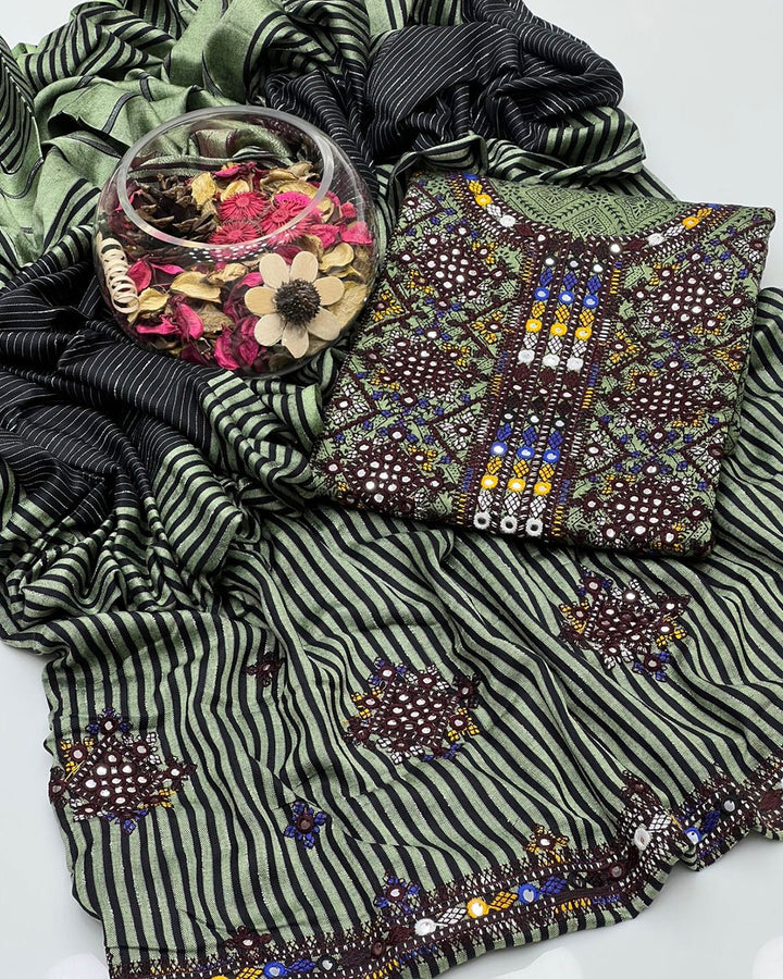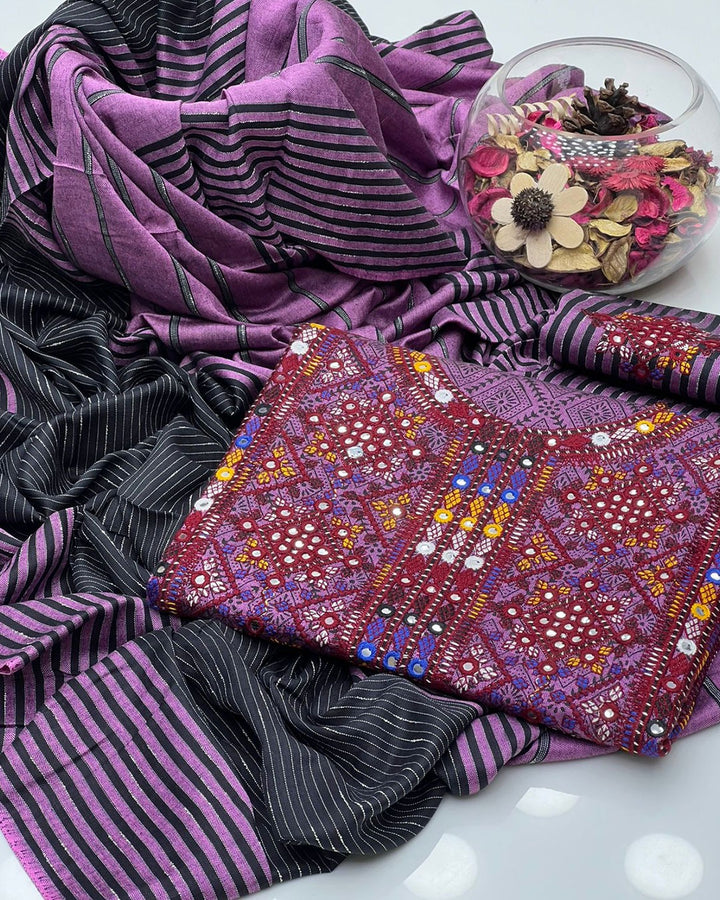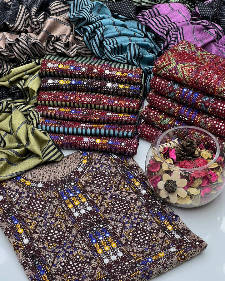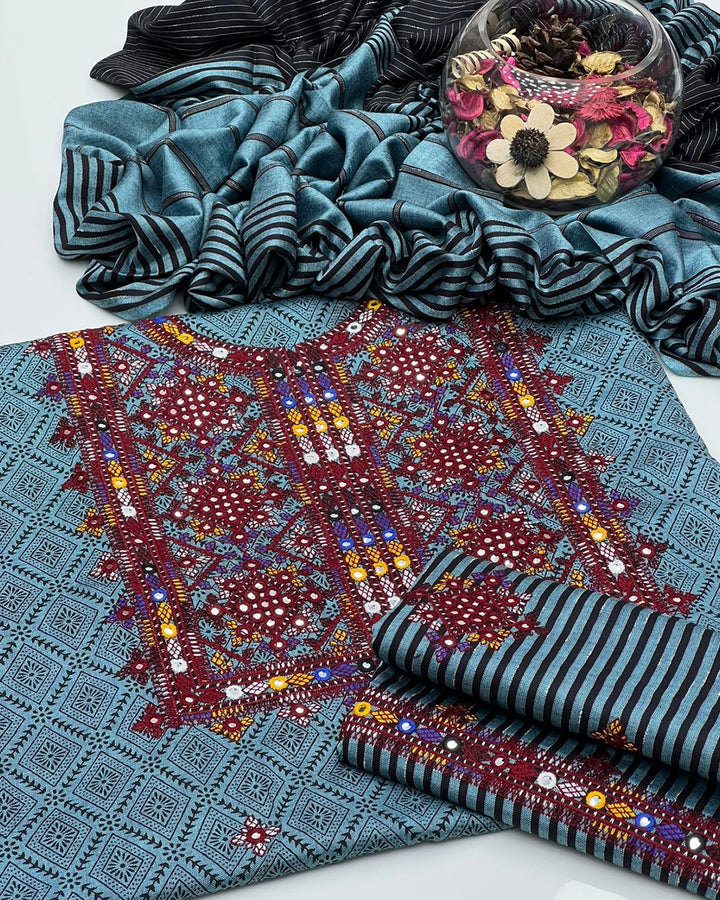 Sussi Linen Balouchi Gala Border Embroidery Shirt With Sussi Lining Embroidery Trouser Along With Sussi Multi Lining Shawl 3 Pcs Dress 👗.