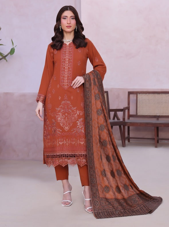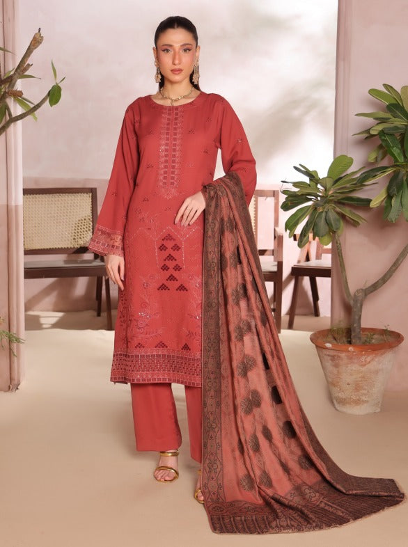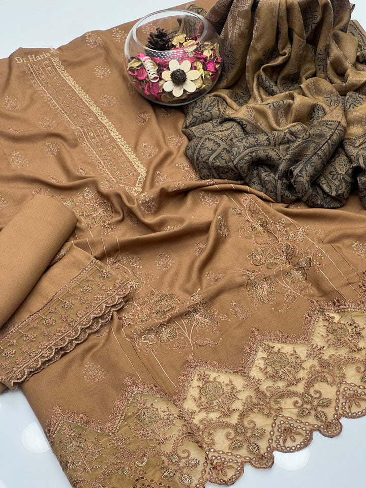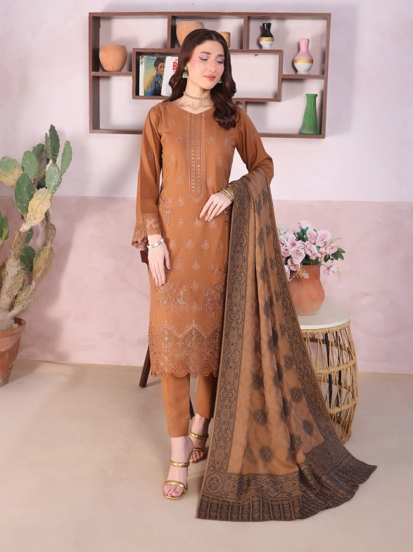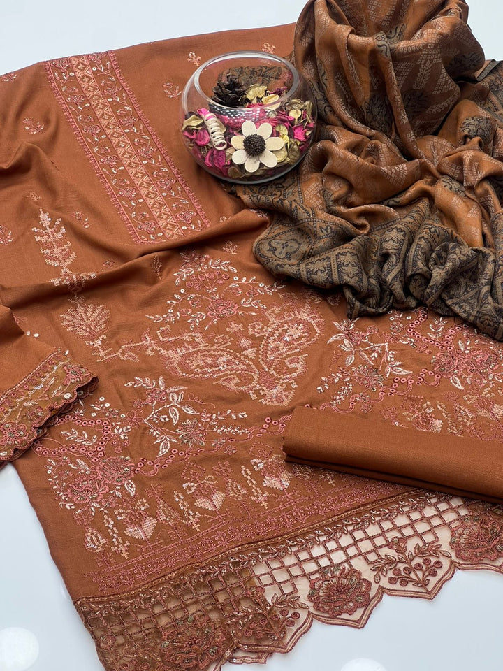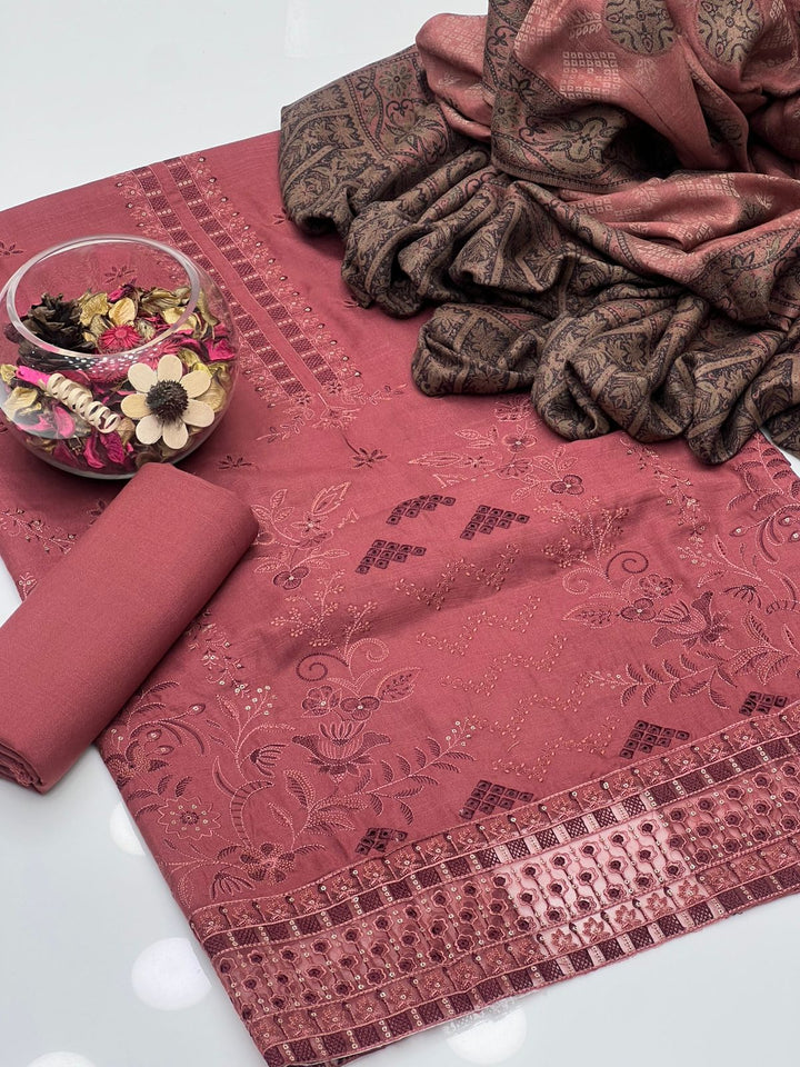 Unstitched Slub Dhanak Peach Embroided Sleeves & Shirt , Plain Slub Dhanak Peach Trouser Along With Premium Wool Jaquard Shawl 3 Pcs Dress π.