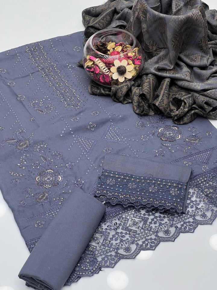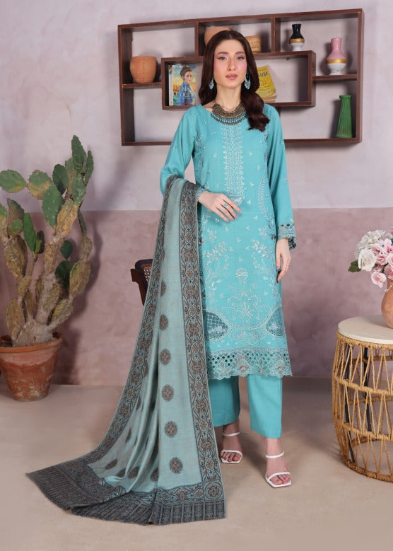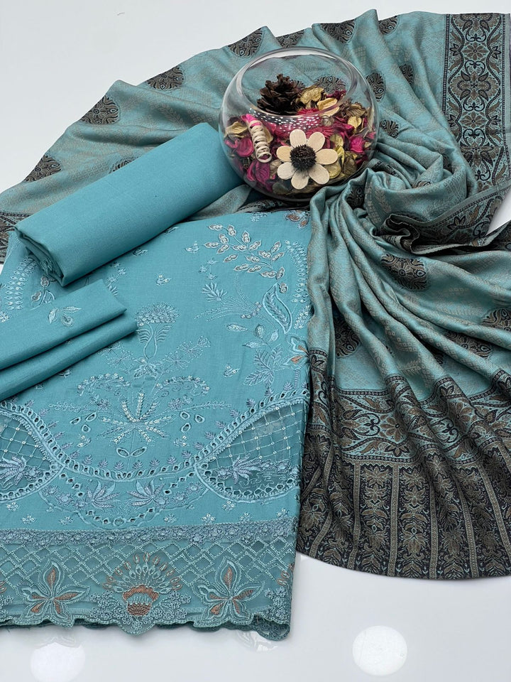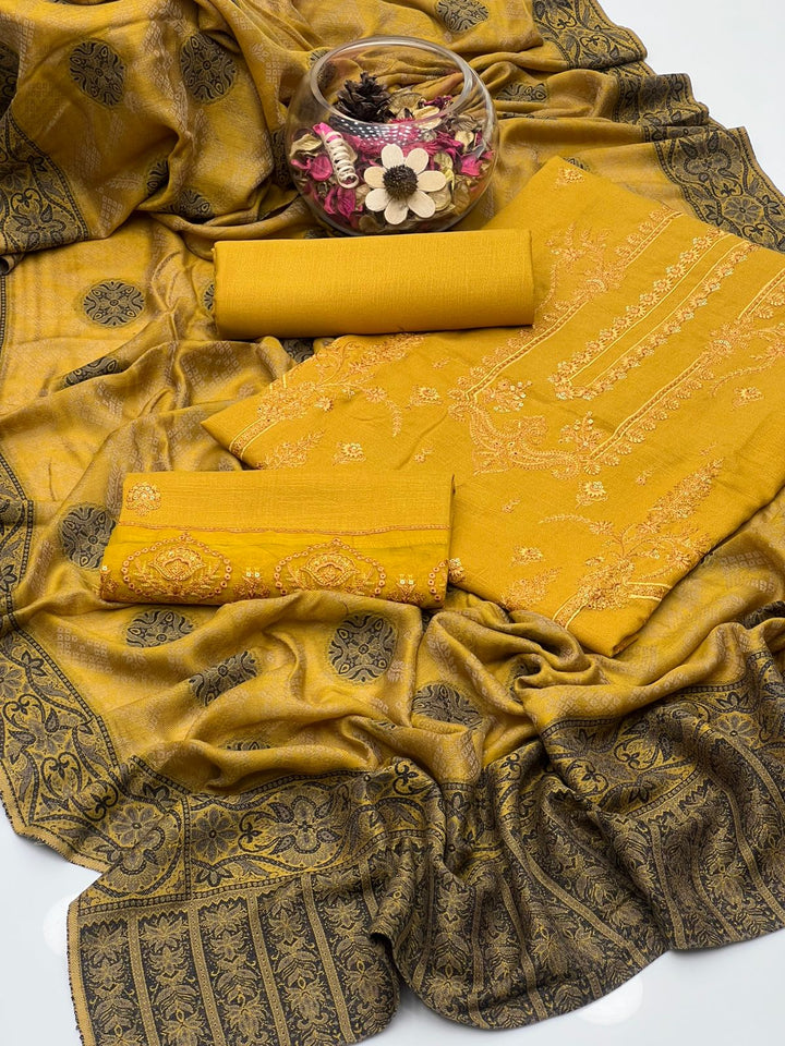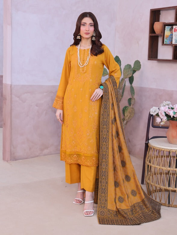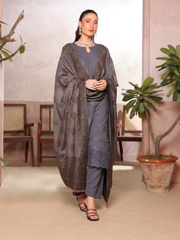Unstitched Slub Dhanak Peach Embroided Sleeves & Shirt , Plain Slub Dhanak Peach Trouser Along With Premium Wool Jaquard Shawl 3 Pcs Dress π.