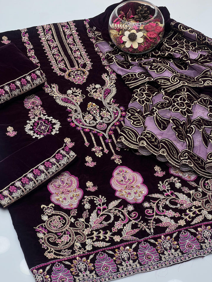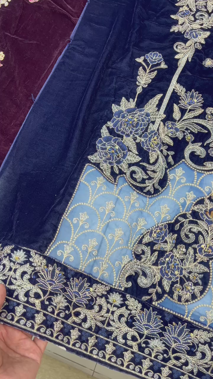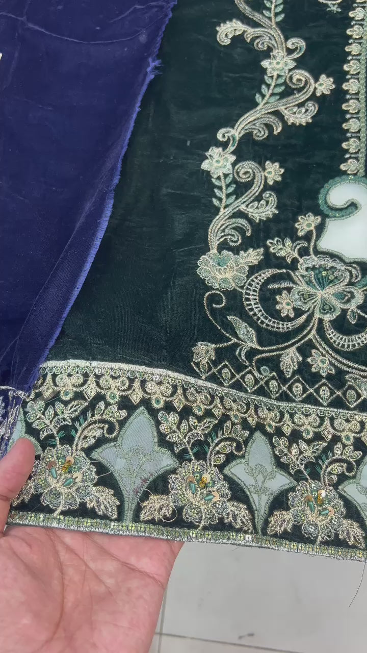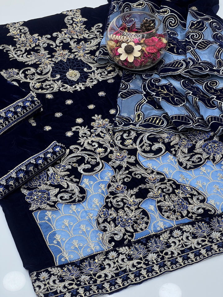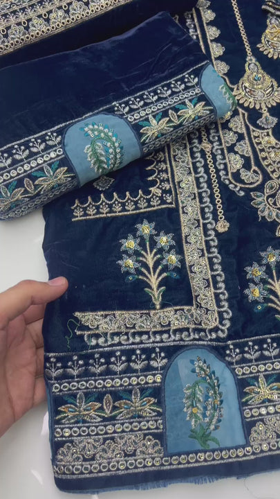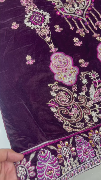 Velvet Front Full Fancy Handmade Beats , Sequence Tilla Heavy Embroidery Work Shirt With Velvet Embroided Trouser Along With Velvet Full Jall Sequence Tilla Heavy Embroidery & Net Cut Work Style Fancy Dupatta 3Pcs Dress π.Β