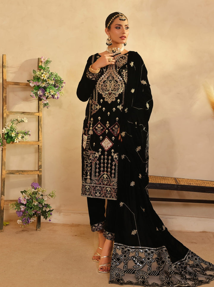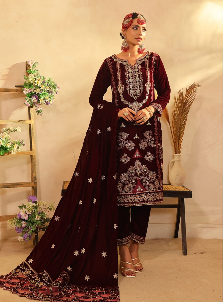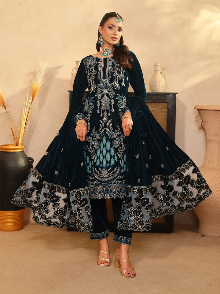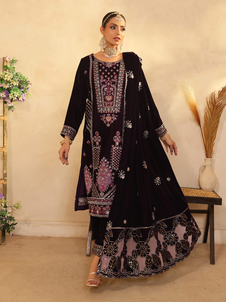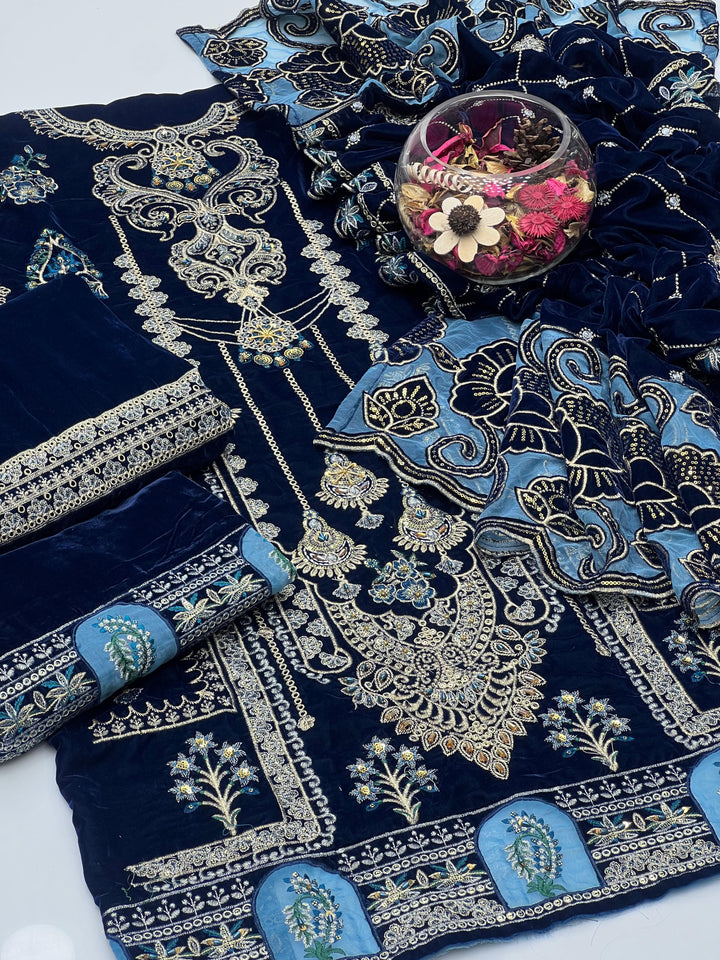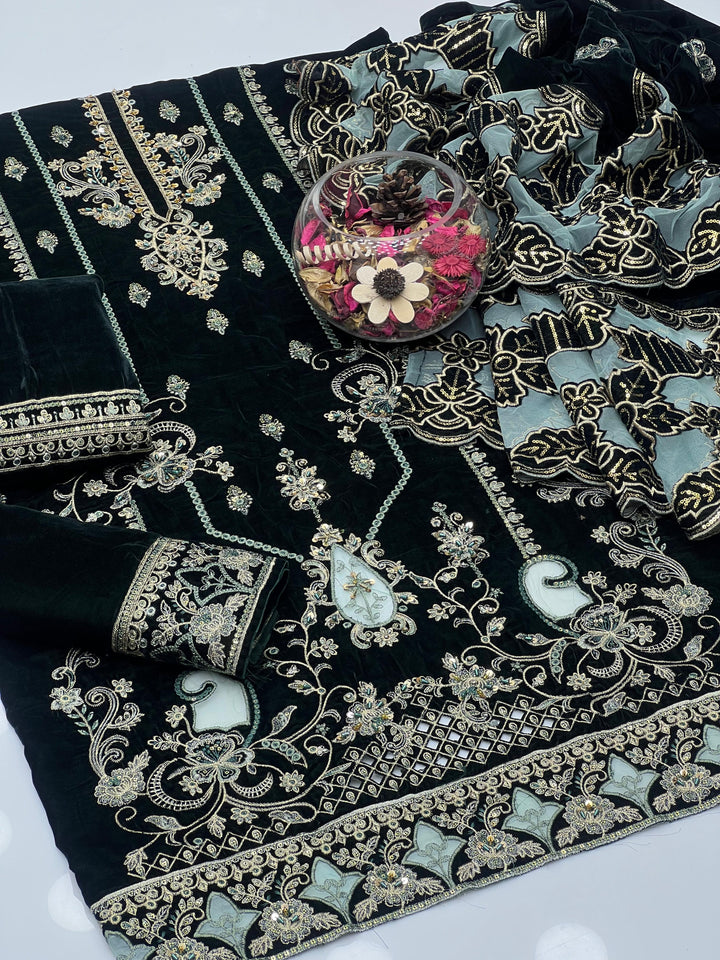 Velvet Front Full Fancy Handmade Beats , Sequence Tilla Heavy Embroidery Work Shirt With Velvet Embroided Trouser Along With Velvet Full Jall Sequence Tilla Heavy Embroidery & Net Cut Work Style Fancy Dupatta 3Pcs Dress π.Β